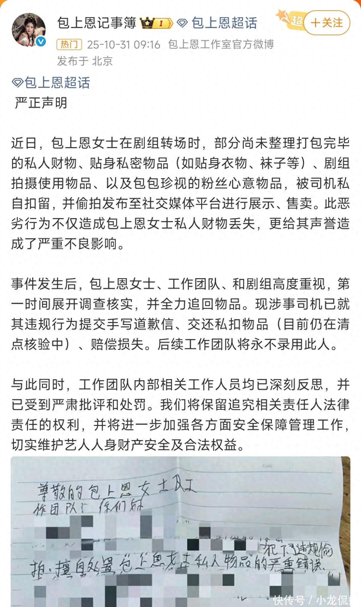 这事儿还得从剧组转场那天说起,包上恩工作室突然发声明,说从威海转场哈尔滨的时候,有个司机把艺人落下的私人物品给扣下了,连贴身衣物都没放过,还拍照挂网上打算卖钱。声明写得挺严重,司机已经写了道歉信赔了钱,团队直接宣布永不录用。
